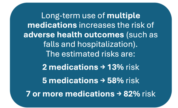 In seniors, such medicines may cause bone fractures and loss of independence. Every additional pill raises the chance of side effects and confusion.
